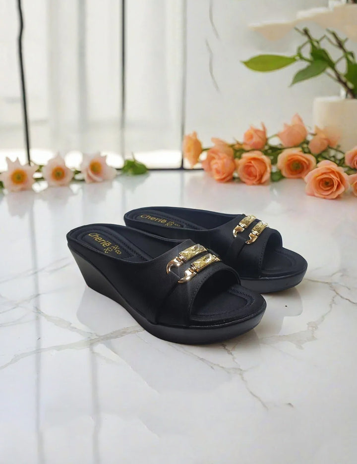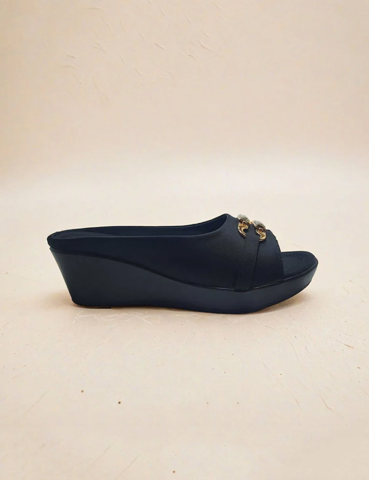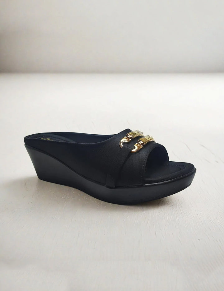 Step into comfort with our Black Wedge Sole Slippers, designed to elevate your everyday relaxation. The sturdy wedge sole provides excellent arch support and stability, making them perfect for all-day wear around the house or quick trips outside. Crafted with a sleek black finish that complements any outfit, these slippers combine style with functionality. The cushioned footbed cradles your feet in softness, while the supportive sole reduces strain on your feet and legs. Whether you're unwinding after a long day or staying cozy at home, these slippers deliver the comfort and support your feet deserve.